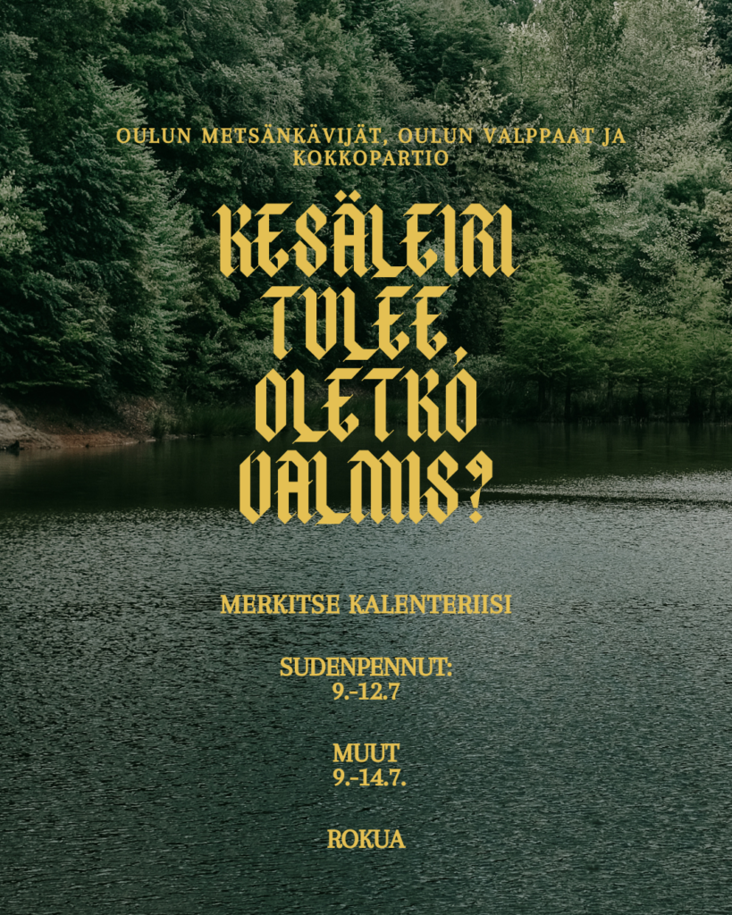 Ensi kesänä järjestämme myös yhteiskesäleirin Oulun Valppaiden ja Oulun Metsänkävijöiden kanssa, joihin olemme tutustuneet aikaisimpien kesien suurempien leirien aikana ollessamme samoissa alaleireissä.