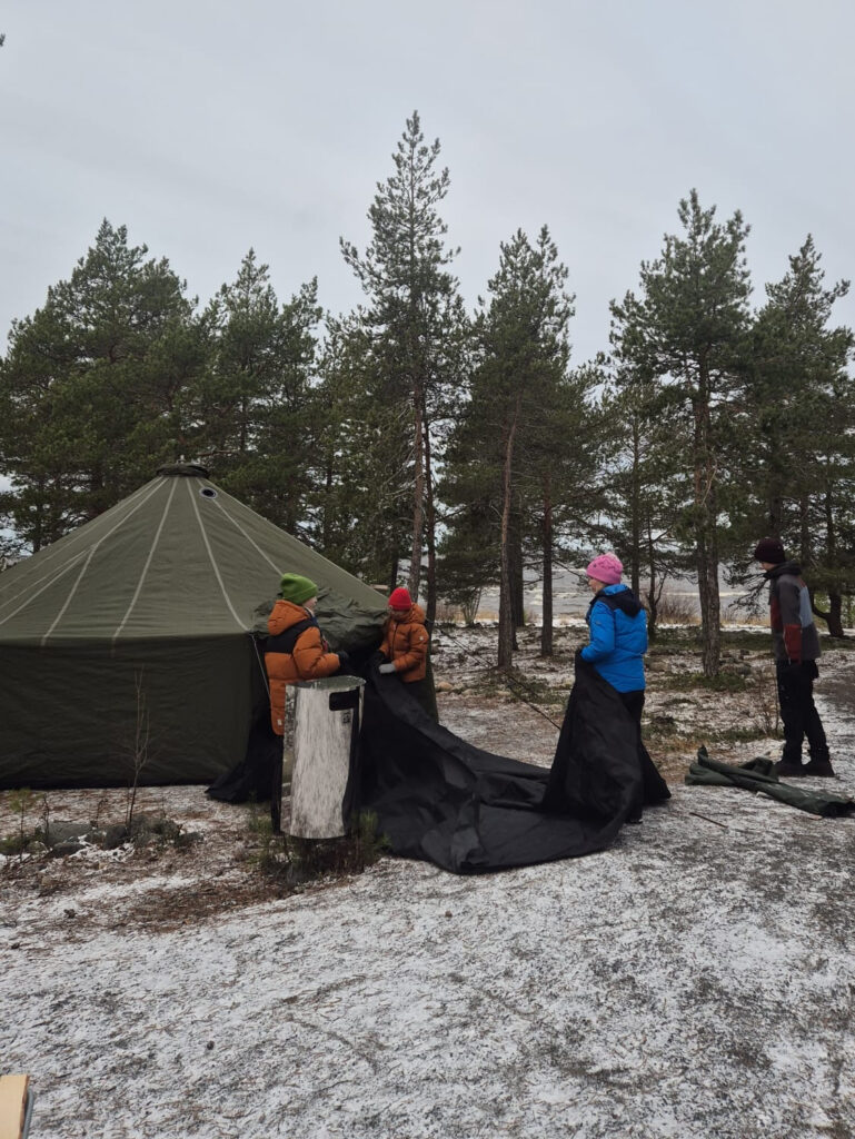 Seikkailijat pääsivät myös kokeilemaan ensimäistä kertaa miten yöpyminen teltassa onnistuu talvella. Ja kuinka teltta pidetään lämpimänä kamiinan ja kipinämikkovuorojen voimin.